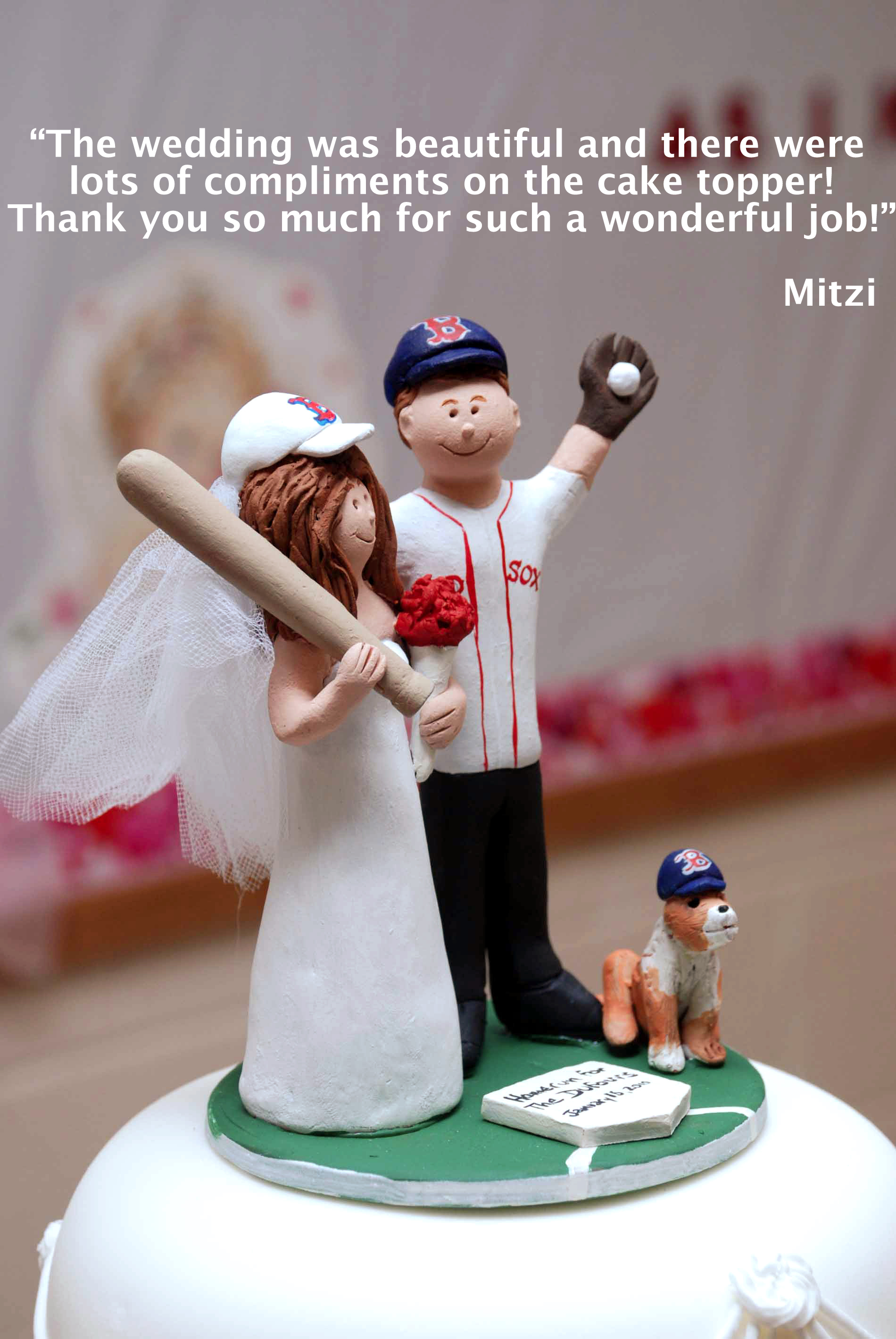 Go Red Sox go! That's the favorite cheer of this couple, who are obviously huge fans of the Red Sox. The groom wears their jersey with pride, and even their dog has a sox cap! As you can see from the bride's comment, this personalized wedding cake topper was a "home run".......